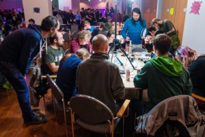 Eine Assembly ist im Grunde ein Versammlungstisch in einer zentralen Halle, in dem ein Verein seinen Bastelkram aufbauen kann, und dient als zentraler Anlaufspunkt für die ansonsten im (äußerst weitläufigen) Versammlungszentrum verstreuten Kollegen. Wer nach dem dritten Talk, fünften Workshop und der drölften Projektbeschauung Energie tanken muss, hockt sich in die Assembly, um eine Mate zu köpfen und entspannt ein paar Zeilen Code in sein Laptop zu hacken oder sich mit seinen Vereinskollegen über das gesehene auszutauschen.