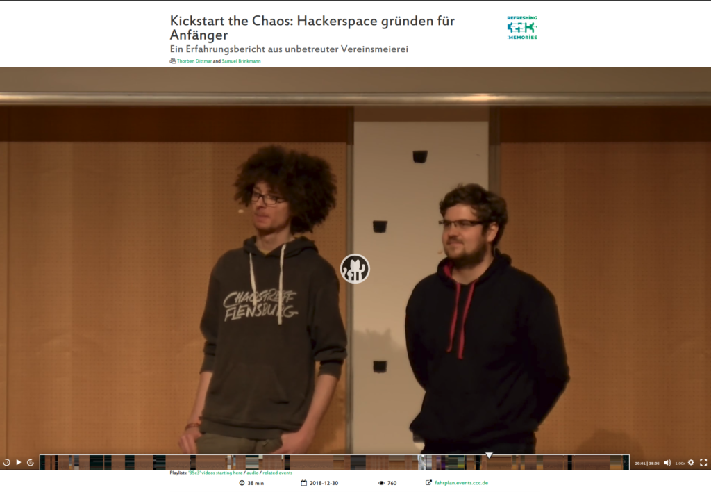 Dieses Jahr gab es auch zwei Vorträge im offiziellen Congress Programm von und über den Chaostreff Flensburg. Als erstes gab es einen Vortrag von Thorben und Samuel zu den Grundlagen der Hackspace Gründung. Den gesamten Vortrag gibt es auch online und ihr könnt den hier ansehen: